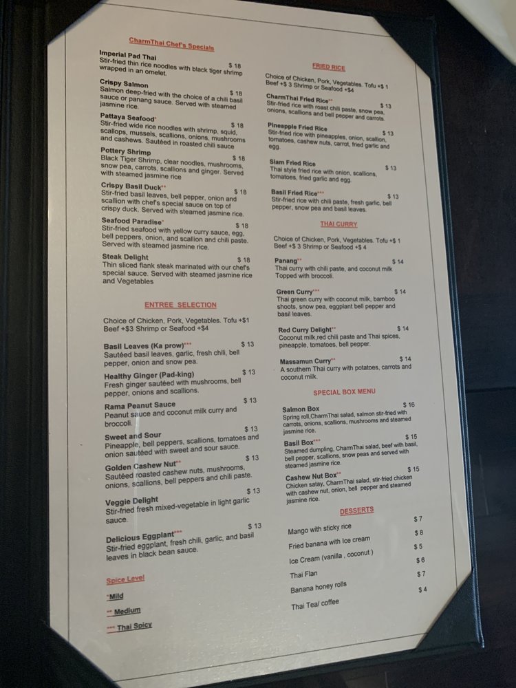 Introducing the menu at Charm Thai, located in Washington, DC, known for its Thai cuisine and bar offerings. With a focus on inclusivity, Charm Thai provides a range of utilities such as delivery, takeout, vegan and vegetarian options, wheelchair accessibility, and even options for cryptocurrency payments. The special box menu features dishes like the Basil Box and Cashew Nut Box, with flavorful options like Charmthai Soup and Chicken Satay for appetizers. Customers have praised the attentive service and delicious food, with highlights including the Coconut milk-based Charmthai Soup and Chicken Satay skewers. The inviting ambiance and diverse menu make Charm Thai a must-visit for Thai food enthusiasts and those looking for a memorable dining experience.